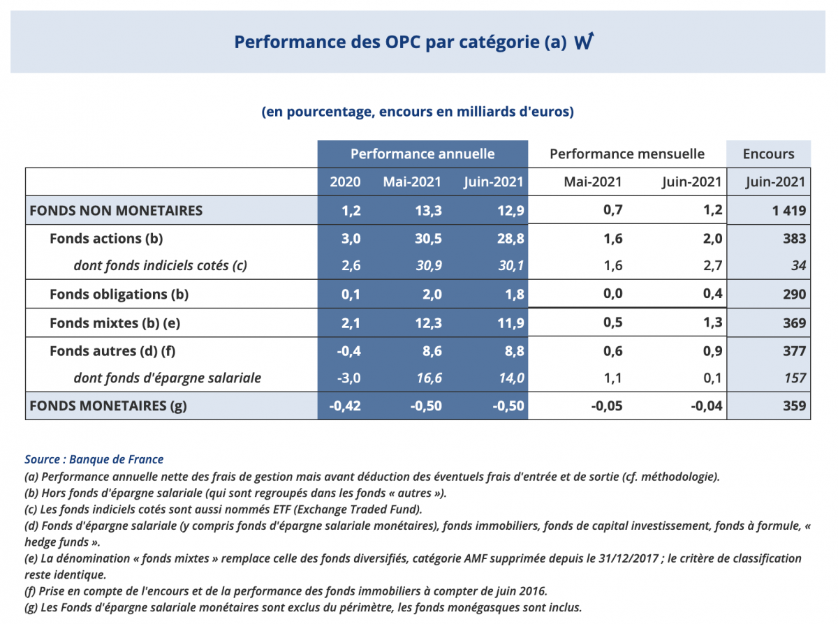 Selon les dernières statistiques publiées le 17 août 2021 par la Banque de France (les prochaines seront rendues publiques le 15 septembre), les organismes de placement collectif en valeurs mobilières (OPCVM) composés de titres d’entreprises ont affiché une performance moyenne de 2% en juin, contre 1,6% en mai. Les ETF (pour Exchange traded fund) font encore mieux : toujours selon l’institut monétaire, leur performance moyenne est passée de 1,6% en mai à 2,7% en juin. Appelés également « Trackers », ces OPCVM reprennent la composition des indices boursiers (c’est pourquoi on parle de « fonds indiciels ») et répliquent ainsi leur évolution.